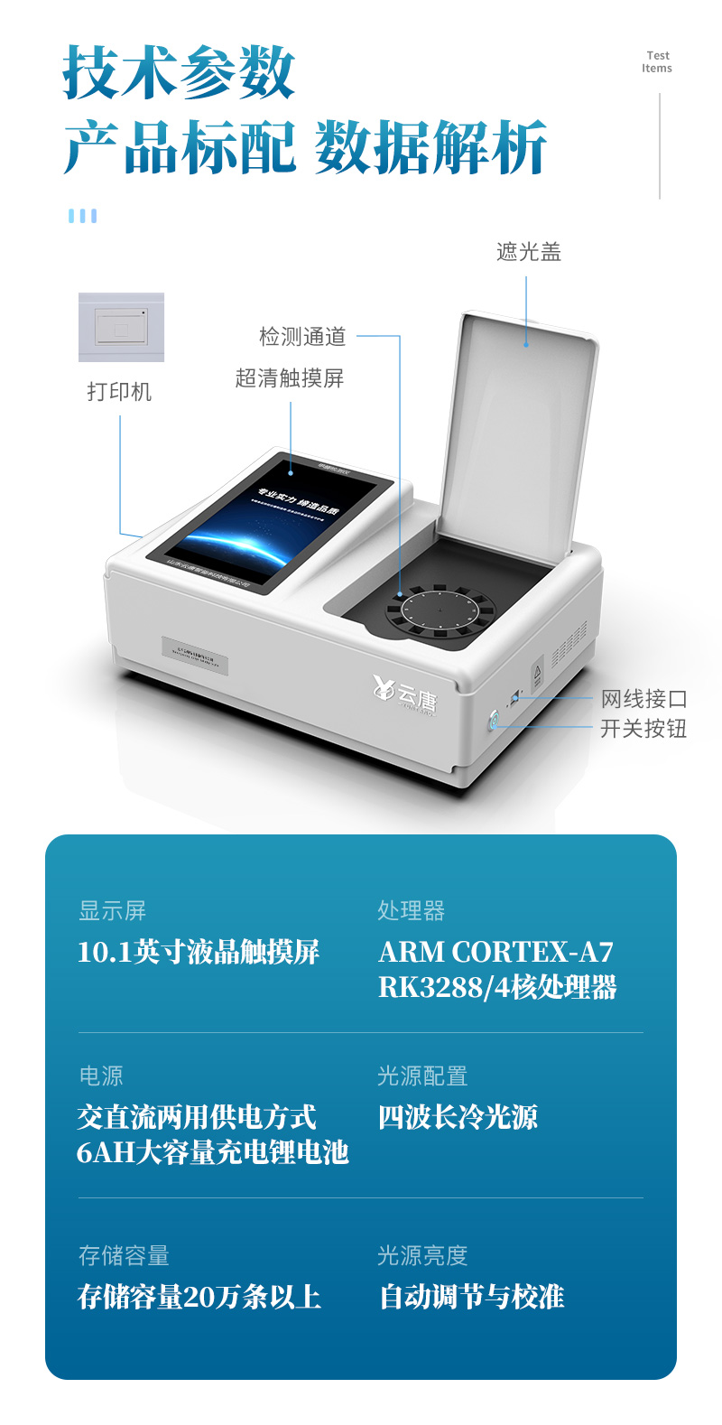 3、顯示屏幕:儀器采用10.1英寸豎向液晶觸摸屏顯,搭配運行安卓智能操作系統,主控芯片采用ARM Cortex-A7,RK3288/4核處理器,主頻1.88Ghz,操作方便,性能更強。